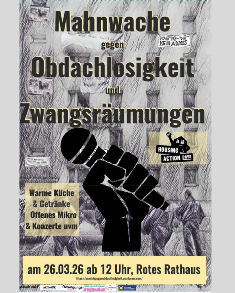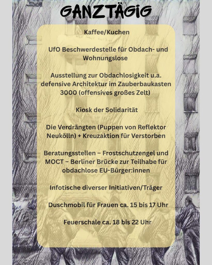 Wir wollen am Tag der Wohnungslosen den Menschen auf der Straße gedenken, die sich unter anderem durch Zwangsräumungen das Leben nahmen oder einfach im Winter erfroren sind, und wollen den Menschen aus der Habersaathstraße und Erfahrungsexpertinnen Raum und eine Stimme geben.