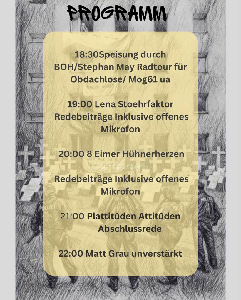 Kommt bitte zahlreich. Leitet diese E-Mail weiter an eure Netzwerke, in eure Nachbarschaften. Bringt Freund:innen, Nachbar:innen und Kolleg:innen mit. Jede Person zählt. Öffentlicher Druck wirkt – und Solidarität erst recht.